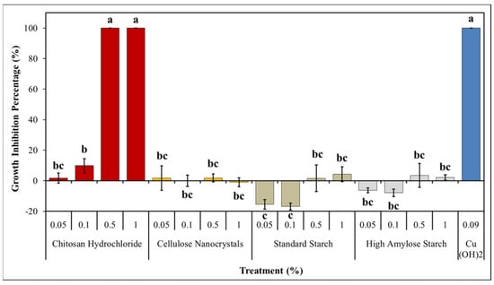 Pst growth inhibition was reported as a percentage (Figure 3). Experiment points out a statistically significant difference among these (p < 0.01). CH showed a total inhibition, comparable to copper hydroxide’s one, at both 0.5% and 1% w/v concentrations. MIC was established for chitosan hydrochloride at 0.5% w/v since lower tested concentrations have shown no significant activity on Pst growth. CNC showed no inhibition effects on Pst, and so both types of ST when used at 0.5% and 1% w/v concentrations. Lower concentrations of ST instead seem to promote Pst growth. This behavior is coherent with the ones showed in previous works, where chitosan, although in different forms, was able to explicate an antibacterial effect on several plant pathogenic bacteria [25,32,33]. Chitosan modes of action against bacteria still remain unclear, even if modern studies have suggested that they could be related to the cationic nature of NH3 groups present in chitosan molecules, which easily interact with negatively charged bacterial cell membrane. This interaction could lead to an alteration of membrane permeability, resulting in an inefficient capability of exchange molecules from outer to inner cell environment; Gram-negative bacteria, due to their higher presence of negative charges onto their membranes, appear to be more sensitive to chitosan [33,73,74]. Other mechanisms that were proposed to explain chitosan antibacterial activity are associated to the capability of disturbing biofilm formation, which is essential for disease development in some bacteria, and to the behavior of chelating metal ions, subtracting them to bacterial cells [75,76,77,78].