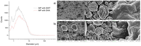 The NMP showed overlapping size distributions with average size ranging around 2.9–3.8 µm (Figure 4). The analysis of particle morphology revealed at least two major dispersed populations: one formed by larger and smoother particles of about 10 µm in size and one constituted by smaller and rougher microparticles less than 5 µm in size (Figure 4a,b), which a closer observation confirmed to be formed by elongated nanostructures resembling those of CNC or starch material (data not shown). No relevant differences were observed when employing high amylose starch or standard starch.