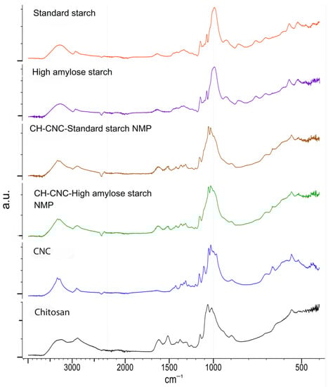 As already reported above for CNC, the IR spectra of CH, starches and CNC did not show particular changing in the main signals. For both NMP formulations, chitosan signals prevail over the other components with no significant differences. In particular, the amide bands of chitosan around 1640 and 1500 cm−1 are predominant in the NMP profiles regardless of the starch type employed (Figure 5). This is consistent with the CC values of nearly 50% for both NMP formulations, as reported in Table 2.