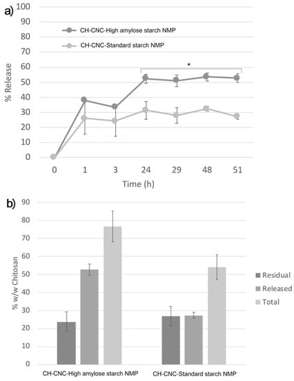 The in vitro release profiles plateaued after 24 h, reaching around 50% for NMP with high amylose starch and 30% for NMP with standard starch. This behavior may be explained considering the gelling capacity of HA starch, which as observed in other cases [79], may enhance swelling thus promoting particle dispersion/dissolution and CH release.