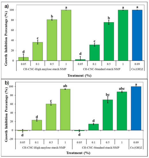 Antimicrobial effects of obtained NMP with different starches were recorded using a microdilution method [69,70]. A bacterial suspension of 106 CFU mL−1 was made, after Pst was grown on KB medium at 27 °C for 48 h. Dilutions at 0.05, 0.1, 0.5 and 1% w/v were made for each NMP with LB broth. 198 μL of each dilution were pipetted in well of a 96 multiwell microplate. Then, 2 μL was of the bacterial suspension was added. LB broth was used as negative control, while copper hydroxide at field dose was used as positive control. For each thesis, a blank was made using only substances. Plates were incubated at 27 °C for 72 h. In order to study the possible bacteriostatic and bactericidal effects of NMP on Pst and their trend over time, at 48 and 72 h absorbance of plates at 600 nm was measured using a spectrophotometer. MIC has been identified as the one where inhibition percentage was equal to 100%. Inhibition of bacterial growth was expressed as a percentage, and calculated as below after subtracting the blank: