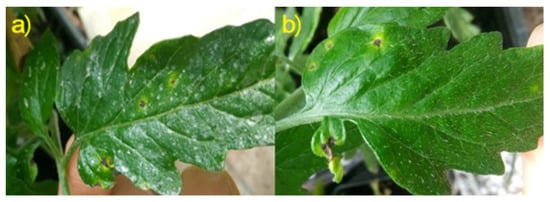 Particular tomato leaves treated with CH-CNC-HA Starch NMP (a) and with Water (b). Point-like necrosis surrounded by a chlorotic halo, which are the typical tomato speck symptoms, as well as the whitish patina that evenly covers the leaf when treated with NMP.
