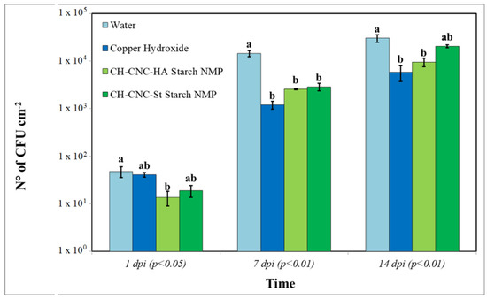 In vitro antibacterial activity of both proposed NMP was tested using a microdilution method. Results were expressed as percentage as reported in Figure 7. At 48 h, a highly significant effect (p < 0.01) on Pst growth was recorded for CH-CNC-HA Starch NMP and CH-CNC-St Starch NMP when used at 1% w/v (Figure 7a). Similarly, to copper hydroxide treatment, a whole bacterial inhibition was reached. Results are consistent with those obtained in preliminary antibacterial assay, where MIC for CH was recorded at 0.5% w/v after 48 h. Indeed, CH content in NMP was seen to be equal to 50%. Surprisingly, an interesting inhibitory effect was recorded for both NMP when used at lower concentrations. In particular, growth inhibition values of 80.9 and 75.2% were noted at 0.5% w/v for CH-CNC-HA Starch NMP and CH-CNC-St Starch NMP, respectively, while when used at 0.1% w/v, NMP containing high amylose or standard starch showed values of 36.4 and 31.2%. The differences in antimicrobial activity of CH with respect to preliminary assay can be explained due the presence of starch, which was able to enhance CH dispersion. The functionalization of CH with starch is therefore a prosecutable way to boost antibacterial effectiveness while at the same time reducing the used amount of active principle. At 72 h, a similar behavior was recorded for both NMP with lower inhibition effects on Pst growth (Figure 7b). However, at 1% w/v concentration neither of two NMP was able to fully inhibit the bacterial growth, as their activity could be compared to copper hydroxide’s one (p < 0.01). Eventually, no bactericidal effect was recorded for tested substances, except for copper hydroxide, since Pst colonies formation was observed in plates after incubating the bacterial suspensions. The decrease in Pst inhibition during time and the absence of recorded values of MBC for tested NMP could find an explanation if CH antimicrobial effects are considered as bacteriostatic rather than bactericidal [73,78]. Obtained results induced the application of both NMP at 1% w/v in following in vivo experiments, in order to achieve the best antibacterial effect during time.