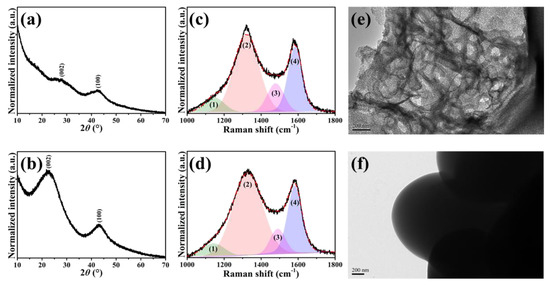 Figure 1 compares the normalized PXRD patterns, fitted Raman spectra and low-magnification TEM micrographs of A-PVP-NC and PI-NC. First of all, two predominant peaks representing the (002) and (100) crystallographic planes of carbon were reflected in Figure 1a,b, confirming the successful preparation of polymer-derived carbon materials with high purity. However, it is obvious that the characteristic peaks of PI-NC were more intense than those of the A-PVP-NC, indicating less crystallinity for the A-PVP-NC. This result might be correlated with the presence of KCl (template) and K2CO3 (activator), leading to the porous and loosely structural features after high-temperature pyrolysis and rinsing procedures. This phenomenon is typically observed from the activated carbon materials [34].