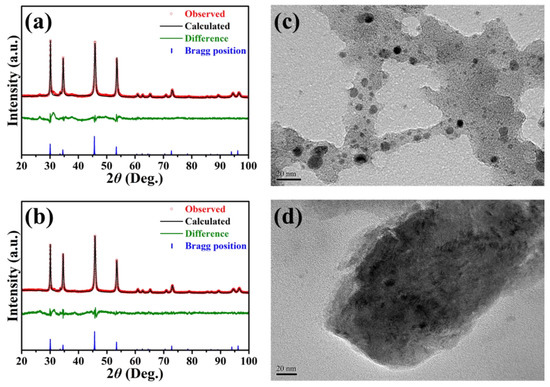 Rietveld refined PXRD patterns and high-magnification TEM micrographs of NiS/A-PVP-NC (a,c) and NiS/PI-NC (b,d). Scale bars of (c,d) are 20 nm.