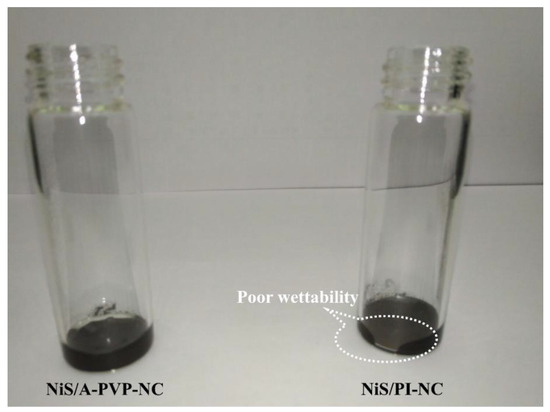 As discussed earlier, the hierarchically porous architectures could provide a variety of properties, enlarging the electrochemical performances of the EES devices [52]. Hence, the compatibility between the NiS/nitrogen-doped carbon nanocomposites and alkaline electrolytes is worth confirming. As presented in Figure 4, it is shown that the NiS/A-PVP-NC was wetted immediately, while the NiS/PI-NC resisted the electrolyte, as highlighted by the white circle. Although the high nitrogen content increases wettability [53], the oxygen-containing functional groups and porous structures deliver more significant contributions [41,54,55]. As a result, the NiS-A-PVP-NC possessed superior wettability, with a 6 M KOH electrolyte, than the NiS/PI-NC. This can also be supported by elemental analysis, since the NiS/A-PVP-NC possessed a much higher oxygen content than the NiS/PI-NC, that is, 7.5% vs. 5.1%.