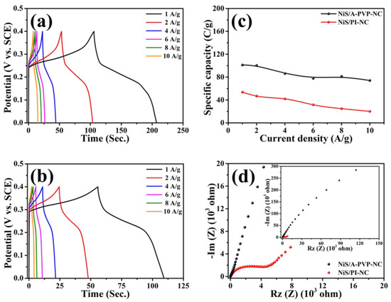 Galvanostatic charge–discharge profiles of NiS/A-PVP-NC (a) and NiS/PI-NC (b), their specific capacities as functions of the current densities (c), and electrochemical impedance spectra (d).