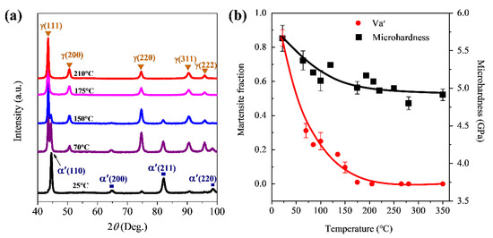 The temperature-dependence of martensite transformation was checked by XRD measurements on the treated surface of SMRT samples. As illustrated in Figure 4a, diffraction peaks of martensite decrease and those of austenite increase in intensities with increasing temperature gradually. In addition, only austenite is detected on the SMRT samples treated at temperatures above 175 °C. According to Equation (1), the volume fraction of martensite on the treated surface reaches ~85% at room temperature and decreases gradually to almost 0 at 175 °C, as summarized in Figure 4b. Meanwhile, the surface microhardness is significantly enhanced on the SMRT samples treated at different temperatures from room temperature to 350 °C with respect to the CG sample, indicating the remarkable grain size refinement and the formation of GNS surface layer. It is noted that surface microhardness values were measured on the sample surface from a planar view in Figure 4b and on the surface layer from a cross-sectional view in Figure 3, so that difference exists in them for samples treated at the same temperature (i.e., room temperature and 280 °C). The first point measured on a cross-sectional sample should be >10 μm from the treated surface. Otherwise, the measured value may be inaccurate due to the interference between the plastic deformation zone around the indent and the sample edge.