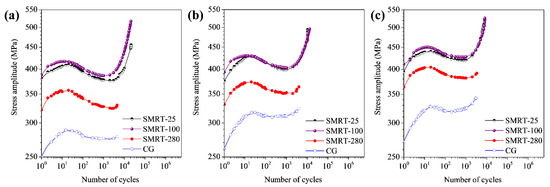 Typical cyclic stress amplitude curves were obtained from the measured stress-strain hysteresis loops with increasing fatigue cycles in different samples. As shown in Figure 5, all samples experience a rapid cyclic hardening process at the beginning of fatigue tests and a subsequent cyclic softening process. In comparison, it is found that much higher fatigue strengths are obtained in the GNS samples than in the CG samples at both stages under a same strain amplitude, while the fatigue strengths of the SMRT-25 and SMRT-100 samples are higher than that of the SMRT-280 sample. For example, the stress amplitudes of the SMRT-25, 100, 280 and CG samples are about 375, 385, 325 and 275 MPa, respectively, at the end of cyclic softening stage (i.e., the minimum values) at the strain amplitude of 0.50%.