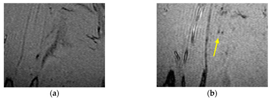 MR images of the mouse calf region (a) lacking IO-NPs and (b) with IO-NPs, as black dots in the image pointed by yellow arrow.