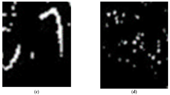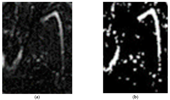 Figure 5a shows a slice of the 3D image of the mouse calf; Figure 5b shows the binary version of Figure 5a by using Otsu’s binary algorithm. In this binary image, calf structure and IO-NPs are present. Figure 5c shows the results of morphological operations on Figure 5b where there are no IO-NPs, only the calf structure is present. In order to extract the IO-NPs from Figure 5b, a subtraction between Figure 5b,c was performed; the results are shown in Figure 5d. The cloud of white pixels inside Figure 5d show the concentration of IO-NPs attached to the drug to be delivered to the mouse calf.