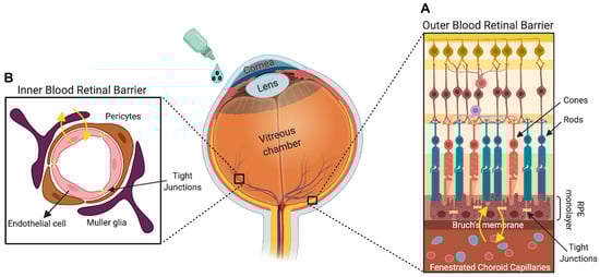The eye is a unique sensory organ that anatomically and physiologically has a direct connection to the sensory nervous system in the brain. The eye is a two-piece unit composed of an anterior and a posterior segment. The anterior ocular segment is made up of the cornea and the lens, and the posterior segment comprises the retina, choroid, and optic nerve. Drug administration to both segments of the eye is accomplished through different routes, and effective delivery is highly challenging for modern ophthalmology. Like the brain, the posterior segment of the eye has several anatomic and dynamic protective barriers, made up of the tight junctions present in the ciliary body epithelium, endothelial cells of the iris, retinal pigment epithelium, and the retina (Figure 1). In addition to providing resistance to several toxins, harmful substances, and microorganisms, these barriers also preclude the diffusion of drug particles to the targeted ocular segments [].