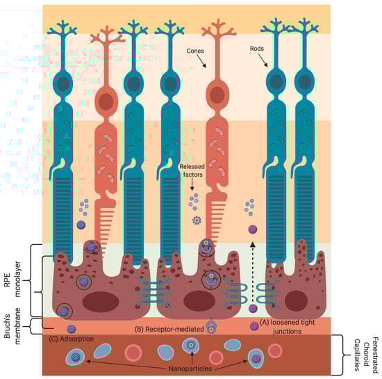 Nanoparticle-based gene and drug delivery to retinal cells has been harnessed to treat various eye diseases [,,,,,,,,]. The various transport mechanisms that nanoparticles employ to cross the blood–retinal barrier are shown in Figure 3. Nanoparticles absorb or scatter light at specific frequencies/wavelengths as a function of their physical and chemical characteristics. These properties of nanoparticles are well suited for bioimaging and to treat cancer by using near-infrared-triggered photothermic therapy (PTT) []. Due to the low absorption coefficients of hemoglobin and water, the penetration of near-infrared (650–900 nm) rays in tissues is very high, allowing the use of near-infrared rays for nanoparticle stimulation without damaging the tissue []. Gold-nanoparticle-based intravitreal injection is used for retinal imaging and for the inhibition of retinal neovascularization to treat macular degeneration [,,]. Gold nanoparticles have been shown to be promising carriers of anti-vascular endothelial growth factor (VEGF) antibodies to targeted sites in the eye [,,]. It has also been shown that gold nanodisks attenuate pathological retinal angiogenesis in a murine model of oxygen-induced retinopathy []. In other words, gold nanodisks are more optically suitable due to their capability to produce signals that are detectable irrespective of the direction of polarization of the light source. Furthermore, gold nanodisks have been shown to minimize reactive oxygen species (ROS) production compared to gold nanoparticles or gold nanorods. In addition, silver nanoparticles have also been shown to reduce VEGF-induced cell migration and proliferation of bovine retinal endothelial cells. Furthermore, in vivo use of silver nanoparticles significantly reduced retinal neovascularization and angiogenesis within metastasizing cells [].