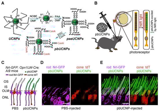 Photoreceptor-binding upconversion nanoparticles (pbUCNPs) and their distribution in the retina. (A) The surface modification for photoreceptor-binding UCNPs (pbUCNPs) is presented. (B) Schematic diagram to show the subretinal injection and binding of pbUCNPs to the photoreceptor outer segments and green light generation after exposure to near-infrared (NIR) light. (C) Schematic diagram to show pbUCNP (green) distribution in the retina. The cones were labeled with Opn1LW-Cre;Ai9-lsl-tdTomato (pseudo color red), and the rods were labeled with Nrl-GFP (pseudo color violet). (D,E) The mice were injected with PBS (D) and pbUCNP, and the self-anchored pbUCNPs (green) are presented as dashed lines in both the inner and outer segments of rods (violet) and cones (red). The outer nuclear layer is abbreviated as ONL; the outer limiting membrane is abbreviated as OLM; the inner segment of the photoreceptors is abbreviated as IS; the outer segment of the photoreceptors is abbreviated as OS. Reprinted with permission from []. Copyright Elsevier, 2019.