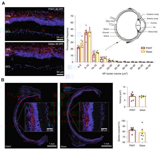 Wide and stable coverage of subretinally injected P3HT nanoparticles in the retina. (A) The Royal College of Surgeons (RCS) rats were injected with fluorescent glass nanoparticles or P3HT NPs at 30 DPI. The image shows the presence of NP fluorescence (red) with bisbenzimide nuclear staining (blue). Z-stack confocal retinal section images were used to estimate the percentage frequency distribution of the volume of NP clusters at 30 DPI. p > 0.10, two-sided Kolmogorov–Smirnov test. (B) A full equatorial reconstruction of RCS rat retinas injected with the indicated NPs at 30 DPI showed the NP (red) diffusion in the whole subretinal space, with no distribution or penetration in the internal retinal layers (insets at higher magnification). The bar graph shows the total NP volume in the subretinal space and the percentage coverage of retina by NPs at 30 DPI. p > 0.05, two-sided Mann–Whitney U-test. The bar graphs represent mean ± s.e.m. of n = 6 RCS rats for each experimental group. Reprinted with permission from []. Copyright 2020 Springer Nature.