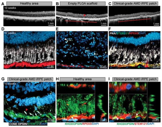 Integration and functional assessment of AMD-patient-derived iRPE patch in laser-induced porcine retinal degeneration model. (A–C) OCT images of healthy retina and retina transplanted with PLGA scaffold or AMD-iRPE patch. The horizontal line shown in (B,C) indicates the transplanted scaffold over an area of laser-induced RPE ablation. (D–F) The retinal sections were stained with PNA (white), STEM121 (green), and RPE65 (red). The green arrow in (F) indicates the integration of AMD-iRPE (green, STEM121) in the injured porcine retina (red, RPE65). The white arrowhead in (E) shows the presence of retinal tubulations. (G) The retinas were immunostained for red, blue, and green cone opsins (white) and STEM121 (green) to observe the presence of pig cone receptors above human iRPE (red arrow). (H,I) The retinas were immunostained with rhodopsin and RPE65 or STEM121. The white arrow shows the presence of phagocytosed photoreceptor outer segments in both the healthy pig RPE (stained with RPE65) and in human iRPE cells (STEM121). Z-sections show the localization of photoreceptor outer segments. Reprinted with permission from []. Copyright The American Association for the Advancement of Science, 2019.