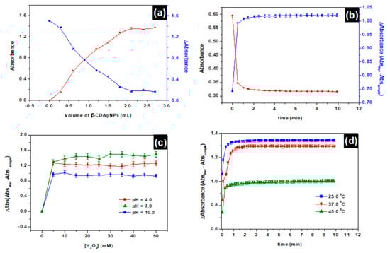 Figure 2c shows an increase in ∆Abs by increasing the concentration of H2O2 until ∆Abs reaches a plateau for the three pH (pH = 4.0, pH = 7.0, and pH = 10.0). The ΔAbs is lower in alkaline pH compared to neutral pH = 7.0 and acidic pH = 4.0, lower ∆Abs corresponds to a higher Abs, which is indicative that the nanoparticles are more stable in alkaline mediums, this behavior could be explained based on hydroxide anions could enhance aggregation of the nanoparticles. The acidic pH = 4 is still presenting a ΔAbs lower (high Abs) than the neutral pH = 7.0 which may be explained by competition reaction between the hydronium ion and H2O2. From Figure 2d, it can be concluded that βCD-AgNPs operate very well at high temperature, since 45 °C is presented with lowest ∆Abs (highest Abs). Thirty-seven degrees, the physiological temperature where most of the biological samples are extracted, presented with the second lowest ∆Abs when adopted for biological analysis. The temperature increases the speed of collision between the H2O2 and sites of interactions on the βCD-AgNPs. Increasing the temperature slows down the process. The reaction is therefore classified as exothermic.