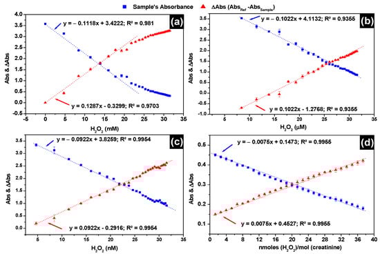 Calibration curves of H2O2 detection using LSPR absorbances of the βCD-AgNPs and LSPR ΔAbsorbance between the reference and the sample (a) 4.7 to 32.0 mM H2O2 range; (b) 4.7 to 32.0 µM H2O2 range; (c) 4.7 to 32.0 nM H2O2 range; (d) 1.3 to 37.3 nmoles of H2O2/mole of creatinine range in the presence of 10 mM creatinine. Absorbances in all experiments are recorded at LSPR λmax = 384 nm and nanoparticles were diluted 3 times.