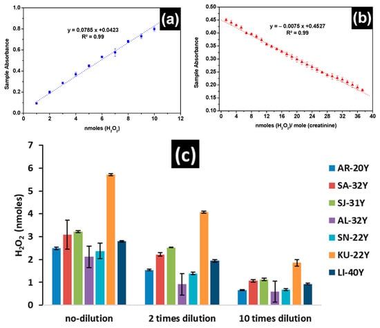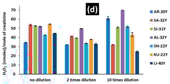 In Figure 5a,b the calibration curves used to assess the levels of H2O2 in freshly voided midstream urine of the 7 healthy men aged between 20 and 40 years are presented, using the assay kit and the LSPR of βCD-AgNPs, respectively. Linear responses are obtained for both tests. For the assay kit a linear response was in the range of 1.0 nmoles to 10.0 nmoles (10–100 μM) with a slope of 0.0785 and a regression coefficient of 0.995, while a linear response 1.33 to 37.3 nmoles of H2O2/moles of creatinine with a slope of 0.0075 and regression coefficient of 0.9955 when the βCD-AgNPs test is used in the presence of 10.0 mM of creatinine. The concentration of H2O2 is dependent on the dilution for all participants, except KU-22, all participants showed lower concentration of H2O2 when samples are diluted 10 times and the assay kit is used (Figure 5c). The average concentration of H2O2 in urine using the assay kit is found to vary between 2.11 ± 0.048 nmoles (21.1 ± 0.48 μM) and 3.22 ± 0.046 nmoles (32.2 ± 0.46 μM) when the matrix is not diluted, between 1.38 ± 0.042 nmoles (13.8 ± 0.42 μM) and 2.52 ± 0.019 nmoles (25.2 ± 0.19 μM) when the matrix is diluted twice and between 0.60 ± 0.051 nmoles (6.0 ± 0.51 μM) and 1.12 ± 0.050 nmoles (12.1 ± 0.50 μM) when the matrix is diluted 10 times. In this current study, the H2O2 total concentration in freshly voided urine in the 7 healthy subjects using the assay kit are comparable to values reported by Long et al. [52] who found values between 11 and 173 μM when analyzing freshly secreted urine of subjects aged from 19 to 38 years old using oxoglutarate decarboxylation assay. H2O2 levels of 17.28 μM are also reported in normal participants not suffering from any disease [53]. However, very high concentrations of H2O2 were noticed in ill subjects, 89.10 8.73, 85.37 15.45, 91.35 17.79, and 68.02 7.23 μM are reported in subjects suffering from helminth + protozoa, protozoa only, helminth and intestinal parasitic, respectively. Lower levels of H2O2 in the order of 0.84 to 5.71 µM are also reported in fasting subjects [54].