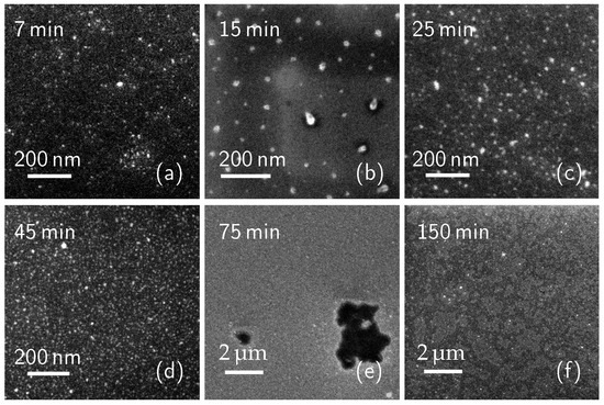 As it can be seen in Figure 1a–d, the molecule cluster surface density grows as deposition time increases. The calculated surface coverage is 2.2% (7 min sample), 5% (15 min), 4.9% (25 min), and 15.4% (45 min), showing a significant increase between 25 and 45 min. At 75 min (Figure 1e), only a few dark areas can be seen. The measured surface coverage is 88.3%. From this data, we can estimate a 100% coverage value at about 100–120 min. The surface of the sample dip-coated for 150 min can be seen in Figure 1f. The image presents bright regions corresponding to terraces, which could be seen as the first layer of DPP molecules, and the second layer of molecule terraces on top of the first. The surface coverage of this sample is then 149%, indicating that there is a full, 100% coverage first layer of molecules directly over the Si surface and the second layer of molecules covering 49% of the first layer surface area. These data will be discussed later, together with the carrier concentration profile measurements. While the presence of multi-layers and their removal from the top of the sample has been mentioned in many previous works [1,42,43], a deep investigation of the cleaning process effects on the molecule layers has not been done yet. In this work, the effects of surface cleaning on the molecule coverage have been investigated by cleaning a group of the produced samples right after the deposition step. Figure 2 shows the SEM plan images of the cleaned samples with a deposition time of 7 (a), 15 (b), 25 (c), 45 (d), 75 (e), 150 (f) minutes. Again, the molecule surface coverage has been evaluated.