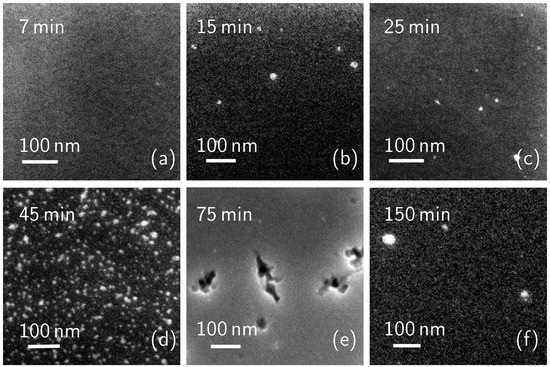 SEM plan images of the cleaned samples at (a), 15 (b), 25 (c), 45 (d), 75 (e), 150 (f) minutes.