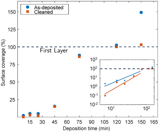 From the data in Figure 3, it can be deduced that at the beginning of the deposition process, in particular up to the 25th minute, the deposition develops slowly. During these early stages, the surface coverage barely changes and, within experimental errors, tends to slightly increase, between 7 and 25 min. At 45 min, we can see that the curve starts to rise. The growth rate escalates between 45 and 75 min. From the comparison between the as-deposited and the cleaned samples, blue and orange data, we can deduce information on the bond type between the aggregates and the substrate. As it is evident, after the surface cleaning, the coverage drops, which could be representative of these bond types: covalent strong bonds and Van der Waals weak forces. Aggregates can be observed in both as-deposited and cleaned samples, even for low deposition times. Since rinsing processes hardly remove chemically bonded molecules, we can take these surface coverage measurements as an indirect quantitative evaluation of existing covalent bonds at the investigated deposition times. The data at 45 min show that both the as-deposited and the cleaned samples present similar surface coverage within experimental errors. This could be an indicator of the fact that most of the present molecules in the as-deposited sample are chemically bonded. This explains the early stage of the deposition, in both cleaned and as-deposited conditions. The rapid increase in coverage, from the 45th minute on, is probably due to a switch in deposition regime: in the first phases of the deposition, the creation of new molecular clusters occurs (nucleation phase), and the coverage increases slowly, while in the second part the created clusters tend to grow (growth phase) as described by the Avrami model [44]. When the second growth regime starts, molecules will also contribute to the growth of the pre-existing clusters. For the time interval 45–120 min the ratio between covalently bonded and physically bonded molecules becomes larger, hence we observe the shrinkage of the difference in surface coverage between as-deposited and cleaned samples. After 120 min, as the first layer becomes complete, a second molecule layer starts to form on top of it. These newly deposited molecules will not be able to bond with the Si surface and will be physisorbed instead. The subsequent surface treatment removes the new layers: this explains the difference between cleaned and as-deposited samples in the latter parts of the investigated growth time. Nevertheless, further data and investigation are needed to understand more about the second layer formation. The inset in Figure 3 shows the log-log chart of surface coverage data, with the lines drawn as a guide to the eye.