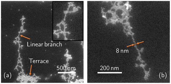 SEM plan images of the samples dip-coated in a 10% concentrated DPP solution for 15 min and cleaned after the deposition step. (a) Molecular branch and terrace, the inset shows a detail of the linear branch. (b) A thin, developed branch.