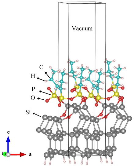Figure 5 shows the optimized geometry of the molecules grafted on a Si (111) surface. As shown in the figure, the molecule assembles itself in packeted groups, which are chemically bonded with each other through P-O-P bonds and with the Si substrate through P-O-Si bonds, with an oxygen atom embedded into the Si surface. In principle, after the optimization process, the molecules located at the valley of the silicon surface were lifted to bond to the next molecules through oxygen. Our calculations reveal that the Si (111) surface structure was deformed due to the strain induced by the significant difference in atomic radius between embedded O (48 pm) and Si (111 pm) atoms. The longest Si-O bond forms with a length of only Å, suggesting strong chemical bonds forming. Because of the strong adsorption between broken DPPs and Si atoms, the Si atoms were forced to move away from their initial positions. By comparing the DFT simulation results with the thinnest part of the branches in Figure 4, we can estimate the number of molecules arranged in the thickness of the branch: since the simulated Si cell is Å wide and there are two molecules per Si cell side, the thinnest part of the branch (8 nm thick) is made of about 24 molecules in a row. To evaluate the formation of the second molecule layer, we put the entire DPP molecule (28 atoms) on top of the first molecular layer. The optimization process was carried out for positions with different vertical distances between DPP and the first layer of molecules (Figure 6). As shown in Figure 6, the shortest distance between the second molecular layer and the first one is Å which is a relatively large distance indicating a weak interaction between the second layer of DPP and the first one. All the bond lengths of the second DPP layer show negligible changes before and after adsorption, indicating that a small charge transfer occurs between DPP and the first molecular layer. These results demonstrate the weak physical adsorption of the DPP molecule over the first molecular layer.