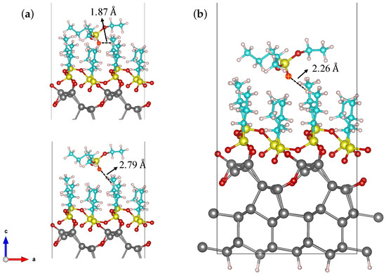 (a) The initial DPP positions including shorter (top panel) and longer (bottom panel) vertical distances from the first layer and (b) the most stable structure of physisorbed DPP on a Si (111) 2 × 1 reconstructed surface covered by a broken DPP layer.