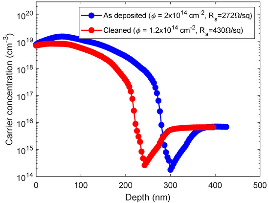 Carrier concentration profile of the as-deposited (blue line) and cleaned (red line) samples with 150 min deposition in a 10% concentrated solution.
