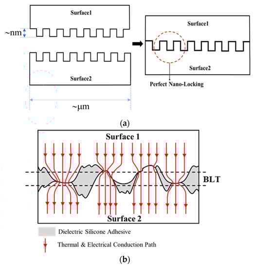 The bond-line thickness is defined as the vertical distance between the baseline of the surface roughness on the two bonding surfaces as shown in Figure 1b. The potential range of BLT is within the maximum and minimum limits, controlled by the highest ridges and deepest valleys on the interconnecting surfaces, as illustrated by Figure 2a,b, while the specific BLT value (within the maximum and minimum range) obtained during a die bonding process is dependent on the bonding pressure.