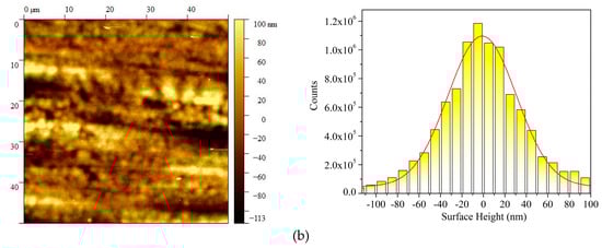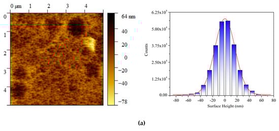 Figure 3 presents surface morphology for the die and substrate metallic pads. As shown in Figure 3a, the AFM image of the die pad shows surface topography and the histogram of roughness height distribution. The surface roughness ranges from −78 ± 2 nm to +64 ± 2 nm. Figure 3b presents the AFM image as well as the surface roughness distribution of the substrate pad. It is noted that the surface roughness ranges from −113 ± 2 nm to +100 ± 2 nm. As a result, the maximum BLT which equals the sum of the highest ridges (on both die and substrate metallic pads) as illustrated in Figure 2a, is (100 ± 2) + (64 ± 2) = 164 ± 4 nm. Similarly, the minimum BLT which equals the value of highest ridge (on substrate metallic pad) minus the value of deepest valley (on die metallic pad), as illustrated in Figure 2b, is (100 ± 2) − (78 ± 2) = 22 ± 4 nm. Therefore, the possible BLT range using the present NL approach is between 22 ± 4 and 164 ± 4 nm. Indeed, three sets of devices made using the present NL approach have the respective BLT value of 28 ± 5 nm, 47 ± 5 nm, and 85 ± 5 nm, which are evidently within the BLT range by controlling the applied pressure during the die bonding process.