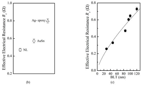(a) Measurement of current (I) and voltage (V) relationship for the devices made of the present NL and conventional die–substrate interconnection and bonding methods. The open square symbol (□) represents the NL bonding with BLT = 28 ± 5 nm, the open circle symbol (○) represents the NL bonding with BLT = 47 ± 5 nm, the open triangle symbol (Δ) represents the NL bonding with BLT = 85 ± 5 nm, the open triangle symbol (∇) represents the AuSn bonding; the open rhombus symbol (◊) represents the Ag-epoxy bonding. The solid curve represents the best I-V fitting. (b) The of different die–substrate bonding and connection methods: the open square symbol (□) represents NL bonding with BLT = 85 ± 5 nm, the open circle symbol (○) represents AuSn bonding, the open triangle symbol (Δ) represents Ag-epoxy bonding. (c) The solid circle symbol (●) correspond to the extracted values for in the NL approach, which indicates decreases with decreasing BLT which can be described by = 0.0215 (the solid curve).