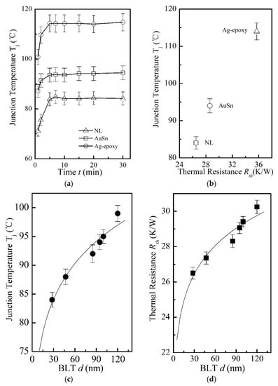 (a) The die junction temperature () of the devices made by three different die–substrate bonding methods: the open triangle symbol (Δ) represents the experimental measurement of for the device made with the NL approach with a BLT of 28 ± 5 nm. The open square symbol (□) represents data for the device made by the AuSn bonding with an industrial standard BLT value of 20 ± 2 μm, the open circle symbol (○) represents data for the device made w with Ag-epoxy bonding with an industrial standard BLT value of 25 ± 2 μm. The solid lines represent the best fitting. (b) The relationship between and : the open square symbol (□) represents NL bonding with BLT = 28 ± 5 nm, the open circle symbol (○) represents AuSn bonding, the open triangle symbol (Δ) represents Ag-epoxy bonding. (c) For the devices made by the NL bonding, is found to decrease with the decreasing BLT, which can be described by = 59.311 ( the solid curve), and the solid circle symbol (●) represents the experimental data for ; (d) For the device made by the NL bonding, is found to decrease with the decreasing BLT, as described by = 19.826 (the solid curve). The solid square symbol (■) represents the extracted thermal resistance .