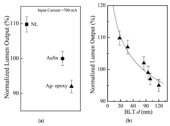 Figure 6a presents the optical performance in terms of normalized lumen output at the suggested maximum input current of 700 mA for the devices made with the NL method, and the comparison to two conventional die–substrate bonding methods. It is evident that the devices made with the NL method (BLT = 28 ± 5 nm) results in a much higher lumen output (Im): approximately 9.8% higher compared with the AuSn bonding, and about 17% higher compared with the Ag-epoxy bonding. For present NL method, lumen output (Im) decreases with increasing BLT and the BLT dependence of lumen output () follows as shown in Figure 6b. This is fully consistent with the prior results on the dependence of and on the applied pressure since BLT is inversely proportional to the applied pressure. Therefore, the normalized lumen output dependence on BLT in Figure 6b is essentially dependent on the bonding pressure.