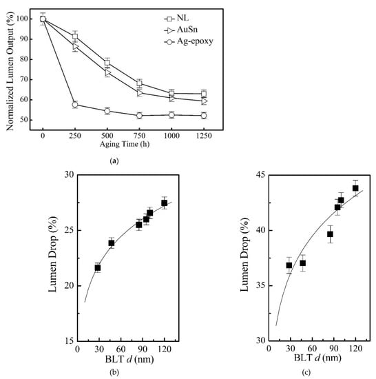 Figure 7b,c describes the lumen drop () at different aging time of packaged devices with different BLTs. The dependence of lumen-drop () on BLT () at an aging time of 500 hr follows a power law relationship as shown in Figure 7b. The same happens to the dependence of lumen-drop () on BLT () at an aging time of 1000 hr follows a power law relationship as shown in Figure 7c. This is fully consistent with the prior result on the dependence of lumen output on the applied pressure as BLT is inversely proportional to the applied pressure.