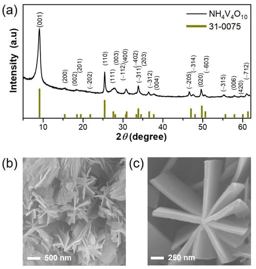 (a) Powder XRD pattern of NH4V4O10 (NHVO) cathode prepared by a microwave reaction, (b) Low and (c) high magnification FE-SEM images of the NHVO electrode.