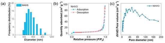 (a) DLS result for the prepared NHVO (b) N2 adsorption/desorption plot and (c) corresponding pore-size distribution plot for the prepared NHVO sample.
