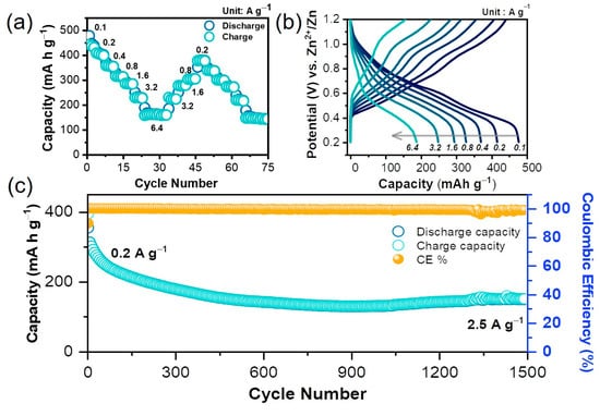 The initial two galvanostatic discharge/charge profiles recorded at a medium current density of 0.25 A g−1 within the 1.2–0.2 V potential range for the prepared NHVO cathode using a coin-type test cell are provided in Figure 4b. The entire process of intercalation/de-intercalation is represented by the typical S-shaped sloping trend that is indicative of a single-phase reaction corresponding to the solid-solution behavior; the observation being in congruence with the CV results. The initial discharge capacity observed for the present NHVO cathode is 417 mAh g−1. This is followed by an initial charge capacity of 374 mAh g−1 thereby facilitating a 90% Coulombic efficiency by the layered cathode. However, in the second cycle, almost 100% reversible capacity is achieved by the present NHVO cathode (Figure 4b). Upon further cycling, although stable coulombic efficiency is maintained, the capacity fading related to vanadium dissolution seems to be experienced at a moderate current density of 0.25 A g−1, as observed from the gradually decreasing trend of the cycle-life profile shown in Figure 4c. In specific, nearly 67% of the highest initial capacity is sustained after 150 discharge/charge electrochemical cycles. Although higher performances are demonstrated for earlier reported NHVO cathodes, the performances presented here are competitive [32,33]. It is apparent that the advantage presented here is that the phase pure NHVO is successfully prepared under a lower reaction time for useful ARZIB applications.