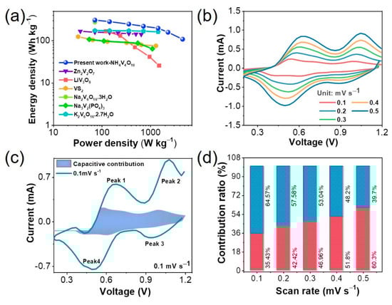 where, i represents the measured peak current and v refers to the scan rate (mV s−1). k1v and k2v1/2 represent the capacitive and diffusion-controlled process, respectively, for a specific sweep rate. Accordingly, considering the case for the CV curve recorded at 0.1 mV s−1 scan rate, the shaded portion corresponding to ~35% of the overall specific-capacity represents the surface-controlled capacitive process (Figure 7c). In other words, this implies that a dominant diffusion-controlled process influences the present NHVO electrode synthesized by the microwave reaction. Nevertheless, the contribution of from the surface and diffusion-controlled process to the overall specific capacity at different scan rates starting from 0.1 to 0.5 mV s−1 are determined and presented in Figure 7d. As anticipated, the plot clearly indicates that the surface-related capacitive process gradually increases with increasing scan rates and is predominant at higher scan rates. This implies that the diffusion reactions highly influence the overall specific capacity at low and medium scan rates.