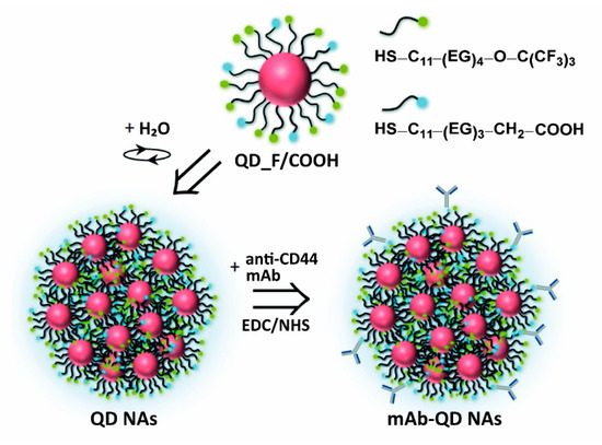 The here prepared and studied NP assembly consist of fluorescent core/shell CdSe/ZnS quantum dots (QDs) modified with fluorinated and carboxylated ligands for their further assembly and functionalization. Fluorinated ligands allowed the self-assembly of the QDs into nanoassemblies (QD NAs) of about 50 nm in diameter, whereas caraboxylated ligands provide the reactive groups for the further attachment of antibodies (i.e., anti-CD44 mAb) by means of 1-ethyl-3-(3-dimethylaminopropyl)carbodiimide (EDC) chemistry. All the synthetic procedures are described in detail in the Supplementary Materials.