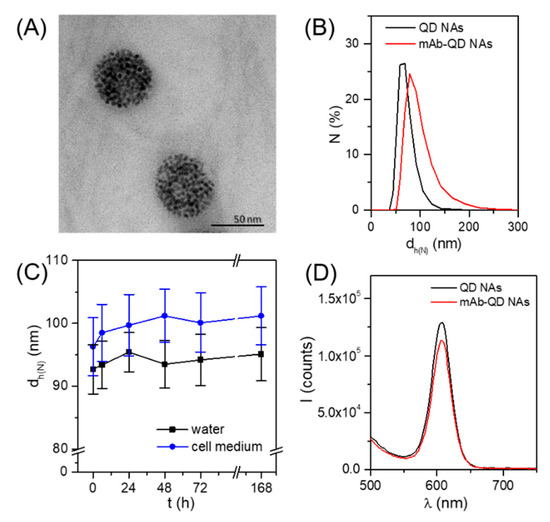 (A) TEM image of the QD NAs with a mean diameter of dQD NA = (58 ± 7) nm; (B) DLS number distributions of the hydrodynamic diameter (dh) of mAb-QD NAs (dh = 93 ± 4 nm; polydispersity index PDI = 0.25) and non-modified QD NAs (dh = 68 ± 3 nm; PDI = 0.21); (C) colloidal stability in terms of hydrodynamic diameter over time of mAb-QD NAs in both water and cell medium; (D) fluorescence emission spectra of the mAb-QD NAs and non-modified QD NAs under excitation at 405 nm.