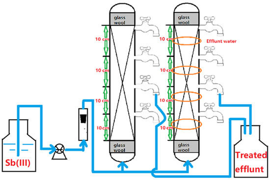 Ion exchange [3], coagulation (coprecipitation) [4], reverse osmosis [5], bioremediation [6], and adsorption [7] are currently accessible technologies for Sb(III) removal from water. Adsorption is a common approach for removing Sb(III) from drinking water due to its economic and technological advantages. Iron (hydr)oxides and elemental iron are commonly used as antimony adsorbents due to their high affinity for Sb(III) and Sb(V) [8]. In developing countries, zero-valent iron powders are utilized in permeable reactive barriers to intercept Sb(III) plumes in contaminated groundwater or added to household filters to remove Sb(III) [1]. Nanoscale zero-valent iron (nZVI) has recently been identified as a promising material for in situ remediations of antimony contaminated water [9,10,11,12,13,14]. Due to its high Sb(III) adsorption capability and huge active surface area, it can serve as a viable material to remove Sb(III) from drinking water. Iron (hydr)oxides and Zero-valent iron, on the other hand, are usually fine powders that cannot be used directly in fixed-bed columns until they are converted into granular form [10]. Ferric hydroxide can be handled as a granulated material or applied to porous carbon, sand, or other materials for fixed-bed water treatment operations. Due to its smaller particle size, direct use of nZVI in water treatment systems may result in rapid nZVI loss and iron pollution in water. Therefore, to treat Sb(III)-contaminated drinking water, nZVI must be loaded onto supporting materials. The batch technique has received greater attention for Sb(III) adsorption. However, adsorption techniques based on the removal of heavy metals carried out in column systems is regarded to be particularly advantageous from an industrial standpoint, due to the column systems’ adaptability to diverse procedures, reduced reagent handling, and consequently low functioning costs [10,11,12,13,14]. As a result, adsorption investigations utilizing columns are required.