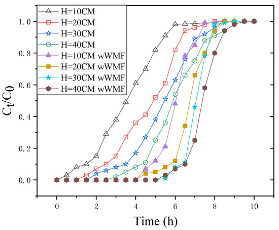 Breakthrough curves of Sb(III) removal by nZNI/AC for different bed depths (wWMF = with weak magnetic field). H = 10, 20, 30, and 40 cm; C0 = 1 mg·L−1; flow rate = 10 mL·min−1; pH = 7.