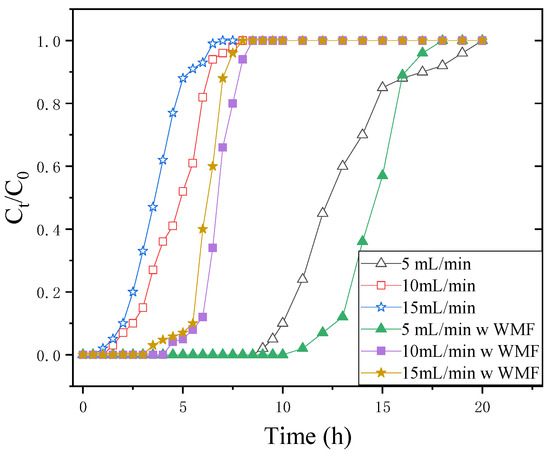 When the flow rate is 5, 10, and 15 mL·min−1, the dynamic adsorption penetration curves of Sb(III) are, respectively 129.3%, 243.0%, and 276.9% when there is no WMF. nZVI accelerates corrosion by WMF, and the produced Fe2+ promoted the removal of Sb(III).