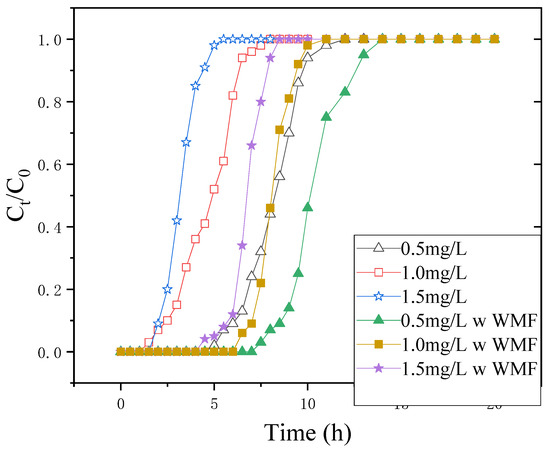 As predicted, increasing the bed size led to a higher volume of treated Sb(III) solution and a higher proportion of Sb(III) omission. The total Sb(III) uptake increased from 1.42 to 2.425 to 3.385 to 4.397 g while increasing the bed height from 10 to 20 to 30 to 40 cm, respectively. However, the equilibrium uptake (qe) decreased from 0.1605 to 0.1370 to 0.1275 to 0.1242 mg·g−1 when increasing the bed height from 10 to 20 to 30 to 40 cm, respectively. Over the same range of bed heights, the total Sb(III) uptake with WMF increased from 3.474 to 2.427 to 1.899 to 1.674 times, respectively. Unlike the sequencing batch experiment that increases the removal effect of antimony with a weak magnetic field, the dissolved iron is also lost from the fixed bed, resulting in a poorer antimony removal effect [7].