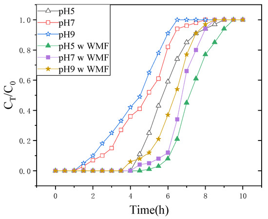 Furthermore, the WMF presence increased the release of Fe2+ significantly. Regardless of the initial concentration of Sb(III), the quicker elimination of Sb(III) due to the presence of WMF was accompanied by a higher release of Fe2+. Figure 2 also shows the significant impact of WMF on Fe2+ release at the lowest Sb(III) concentration of 0.5 mg·L−1, which corresponds to its impact on Sb(III) elimination. According to the observations at various pH levels, WMF’s significant influence on Sb(III) elimination was directly related to its effect on Fe2+ accumulation. When Liang removed selenite with zero-valent iron and a modest magnetic field, he got identical results [16].