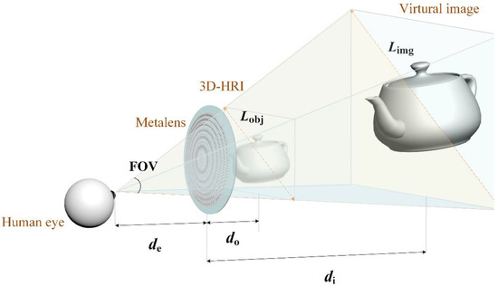 The basic working principles of the proposed MCGH-NED system that enable the transparent metalens to act as an eyepiece can be illustrated as follows. As shown in Figure 1, the transparent metalens is placed in front of the human eye, and the 3D-HRI, as the imaging object, is placed within the focal length, which is denoted by f, of the metalens eyepiece, where Lobj is the object size, Limg is the virtual image size, de is the eye relief distance, do is the object distance, and di is the virtual image distance. For this singlet lens imaging system, do and di can be set free as long as di is smaller than the focal length of the metalens. Then, the virtual image is modulated by the metalens eyepiece, floated to the desired location, and imaged onto the human eye or camera, where the displayed virtual image may be enlarged as needed. Thus, the FOV of the system is determined by the eyepiece size as well as the eye relief distance, rather than by the display size, which results in the metalens eyepiece being superior to conventional eyepieces [16], and the corresponding FOV can be expressed as 2 tan−1 [Am/(2de)], where Am is metalens eyepiece aperture. Furthermore, the largest display object size of the 3D-HRI is decided by a FOV such as fAm/de. It is clear from the above analysis that the desired HRI display size and the image position are linear to f, and the FOV of the device is directly related to Am, so the transparent metalens eyepiece should have a relatively short focal length and large aperture, which means a large numerical aperture (NA).