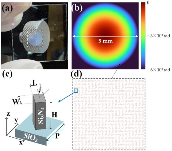 where (x, y) represents the horizontal position along the metalens interface in the Cartesian coordinates, (fx, fy, fz) is the position of the designed focal point, f is the root of quadratic sum of fx, fy and fz, denoting the focal length, λ is the design wavelength, and n is an arbitrary integer. In this design, the focal length and the position of the focal point are set to be 6 mm and (0, 0, 6 mm), respectively, and the diameter of the metalens aperture is 5 mm, indicating an NA of 0.4. In addition, the corresponding phase profile that should be imparted along the metalens interface according to Equation (1) is shown in Figure 2b.