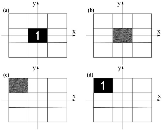 Figure 3, above, demonstrates an example of the partitioned Fresnel diffraction method. Assuming that U2sub(x2sub, y2sub) in Figure 3a represents the original image of the number “1”, U1sub(x1sub, y1sub) is the sub-hologram produced from U2sub(x2sub, y2sub) as depicted in Figure 3b. When this sub-hologram is shifted to the location of () as shown in Figure 3c, Equation (3) can be derived as